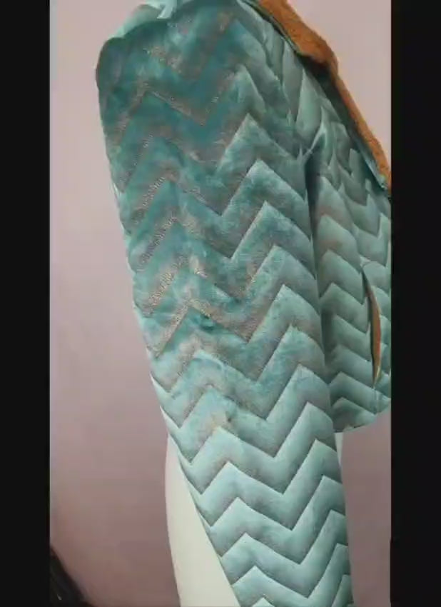 Handmade in Edinburgh by Cerri Mackenzie Design. This 3D velvet chevron biker style jacket fabric is limited edition, once these two pieces are gone they are gone! this gorgeous cropped jacket has super soft caramel shearling collar, bright teal cotton lining with pockets and front zip closure.